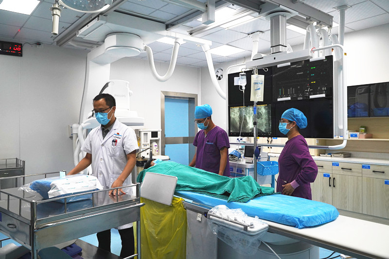 CT结果一:未见出血。患者头颅CT结果未见脑出血,卒中二线指示患者诊断“急性脑梗死”,有“静脉溶栓及介入取栓指征”适应证、无禁忌证,建议立即予静脉溶栓治疗。患者送到神经内科,查看患者后再次与家属沟通,同意静脉溶栓治疗并签署知情同意书。在溶栓过程中与家属沟通病情,考虑大血管闭塞可能性大,可溶栓后桥接急诊脑动脉造影+取栓治疗。再次查看患者肌力无恢复,生命征平稳,征得家属同意并签字后立即启动导管室。患者送到导管室后,放射技师、介入护士和麻醉科医生做好一系列规范处置,为患者进一步治疗。