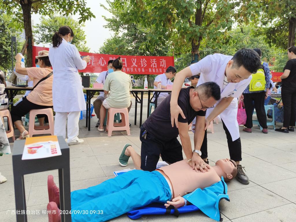 9月29-30日,广西科技大学第一附属医院胸痛中心联合多个胸痛救治单元,组织开展护“心”大型义诊活动,宣传心血管疾病知识,发放心梗救治宣传手册,培训心肺复苏术等;医护人员以多形式、多角度传播心血管疾病相关知识,使老百姓加深对“心”的认识。