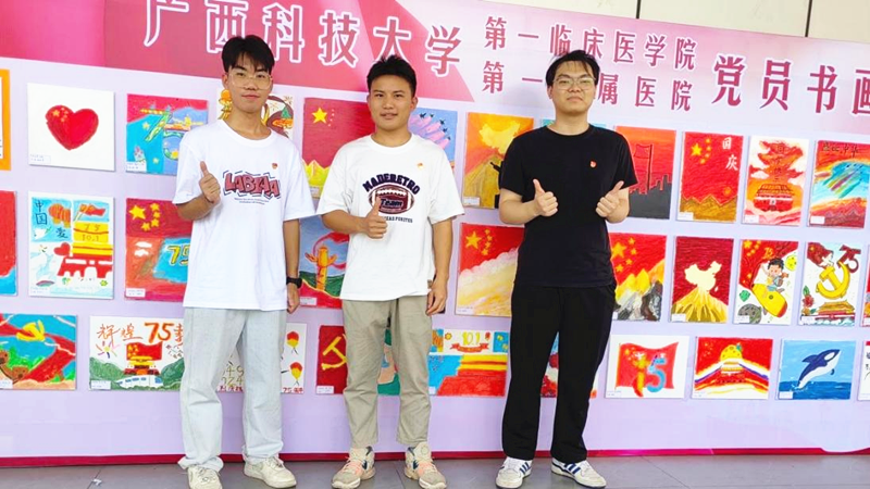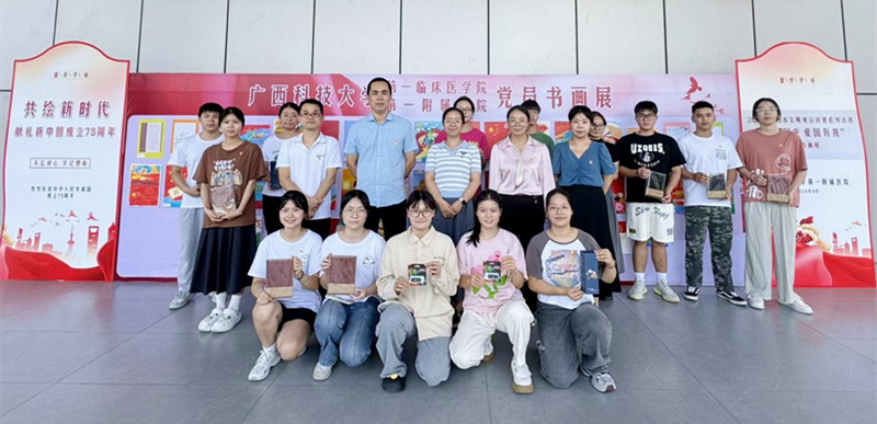 为庆祝新中国成立75周年,广西科技大学第一临床医学院师生党员围绕国庆主题,手执画笔,以书画献礼国庆。9月29日,经过遴选的40余幅优秀书画作品,在白沙教学点舞台面向全院师生进行展览,展出时间为9月29日-10月1日。党员们以笔墨为媒,以色彩为语,表达对祖国的真挚热爱和美好祝愿。