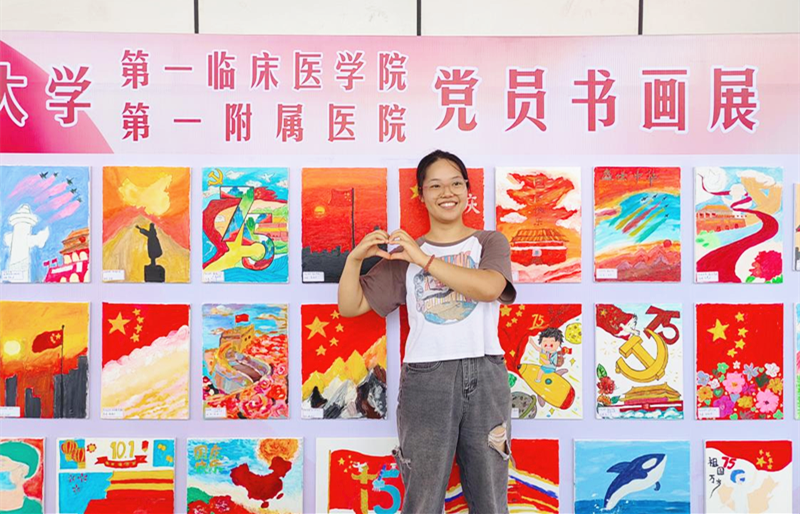 学生第三党支部书记王向:“一临床师生党员通过共为祖国画幅画,礼赞新时代,献礼国庆,以实际行动表达对党的热爱和祖国繁荣昌盛的美好祝愿。此次书画展不仅是艺术的展示,更是精神的传承和传递。”