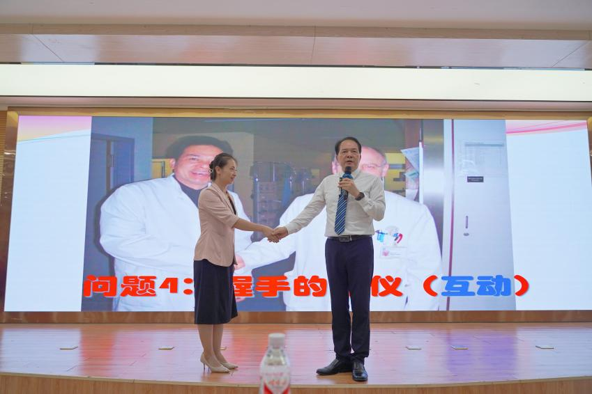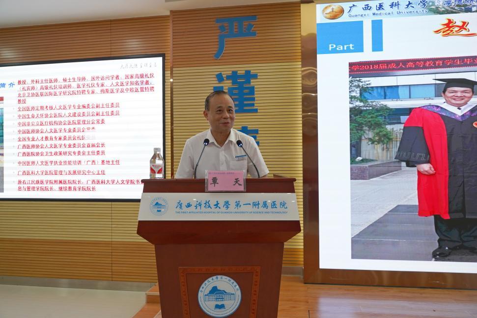 紧接着,授课正式开始。赵邦,教授、外科主任医师、编审,硕士研究生导师,国外高级访问学者,人文医学知名学者,国家高级礼仪培训师(高级礼仪礼宾师),医学礼仪专家。广西医科大学医院管理与发展研究中心主任,中国医师人文医学执业技能培训(广西)基地主任。一直在高校从事医疗、教学、科研及管理工作。
