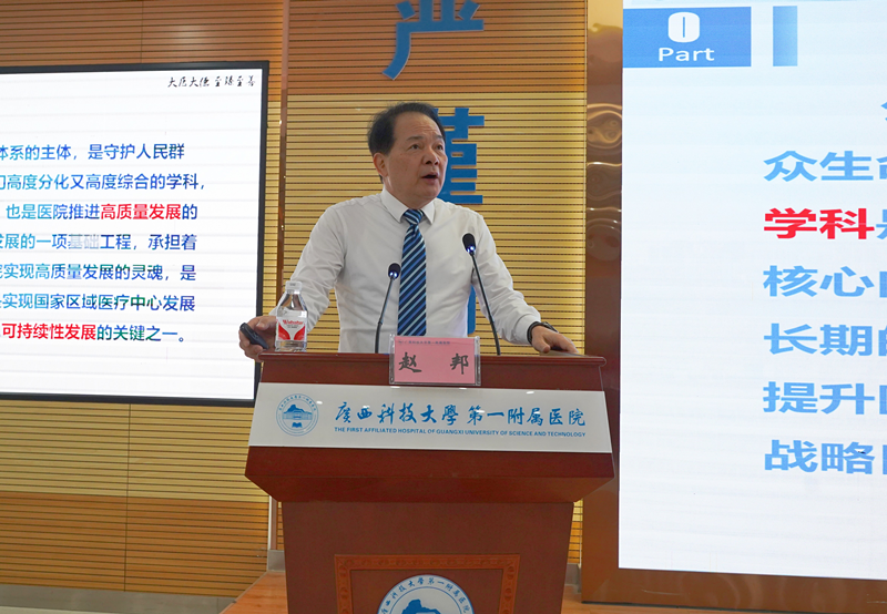 覃天在授课开始前致欢迎辞。他首先代表医院对赵邦教授前来授课表示热烈欢迎,并表示,中层干部是建设高水平医院的中坚力量,中层干部综合素质能力提升是医院干部队伍建设的重要抓手,希望全体参训的中层干部认真听讲,将授课知识全盘消化吸收,转化为推动医院高质量的动力。