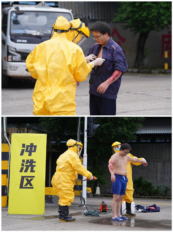 在本次危险化学品事故的紧急医学救援演练具体实施过程中,摸拟柳北某厂区发生危险化学品泄漏并导致多人受伤,在现场开展综合救治的全过程。重点演练灾害发生时的多部门应急响应、伤员从第一现场向安全区转移、初检区的环境监测和对暴露者进行冼冲、伤员从初检区到救治区的转运、救治区的紧急医学救援、现场信息报送以及伤员从救治区向院内的转移和院内救治等。