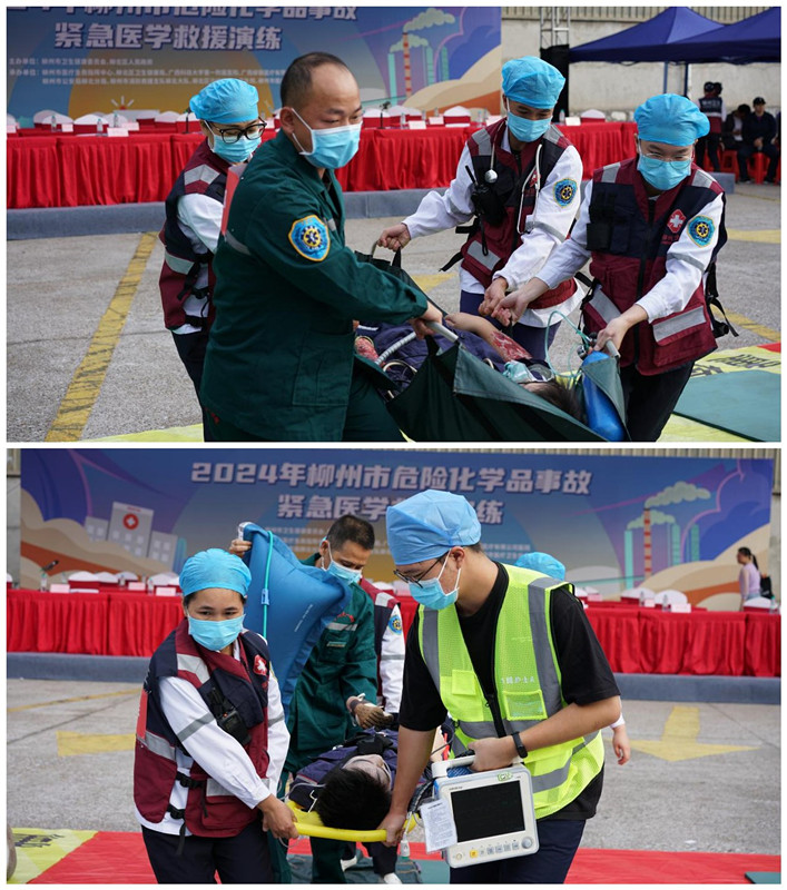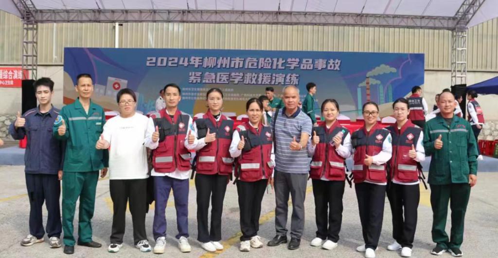 2024年10月16日上午,由柳州市卫生健康委、柳北区人民政府主办,柳州市医疗急救指挥中心、柳北区卫生健康局、广西科技大学第一附属医院、广西柳钢医疗有限公司医院、柳州市公安局柳北分局、柳州市消防救援支队柳北分队、柳北区沙塘中心卫生院、柳州市医疗卫生信息协会承办的“2024年柳州市危险化学品事故紧急医学救援演练”在柳钢物资部总库成功举行。