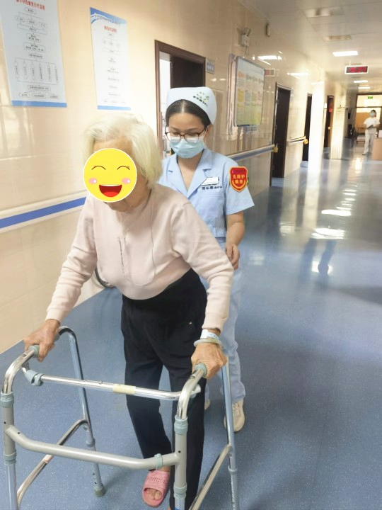 但我们没有退缩,医、护、技及照护师四方迅速行动。医生们仔细研究奶奶的病情,制定个性化的康复方案;护士们精心护理,时刻关注奶奶的每一个需求;治疗师们则耐心地指导奶奶进行康复训练,照护师每天耐心给奶奶洗漱、如厕、洗头、喂饭,还耐心的跟奶奶聊天、陪奶奶训练。一步一步,循序渐进,在大家的共同努力下,奶奶从最初的无法下床,到现在可以自己吃饭,扶助行器还能独立行走。奶奶脸上的笑容越来越多,那是对我们最大的认可。