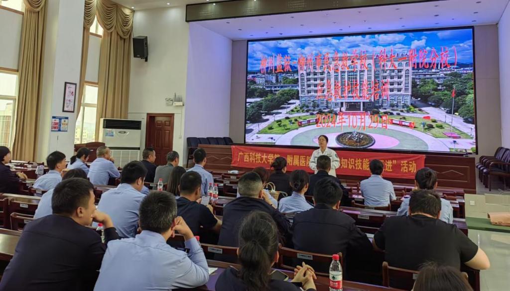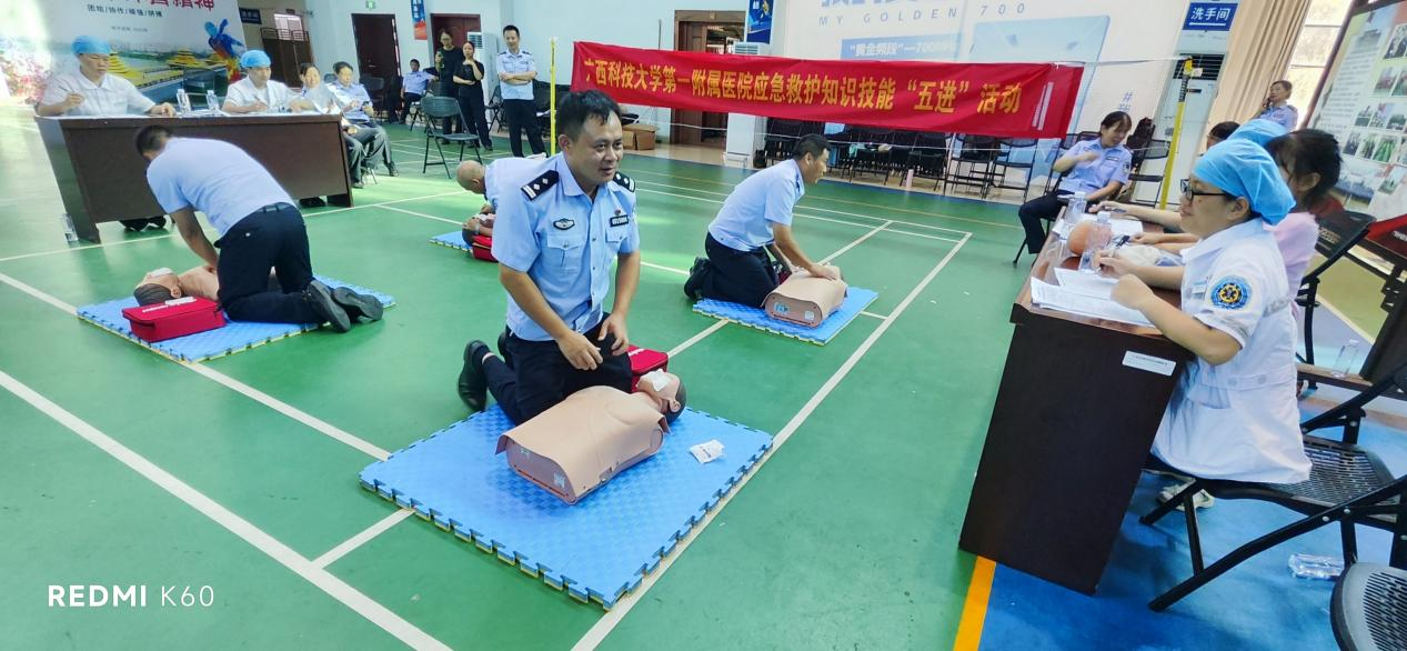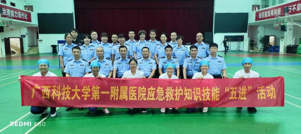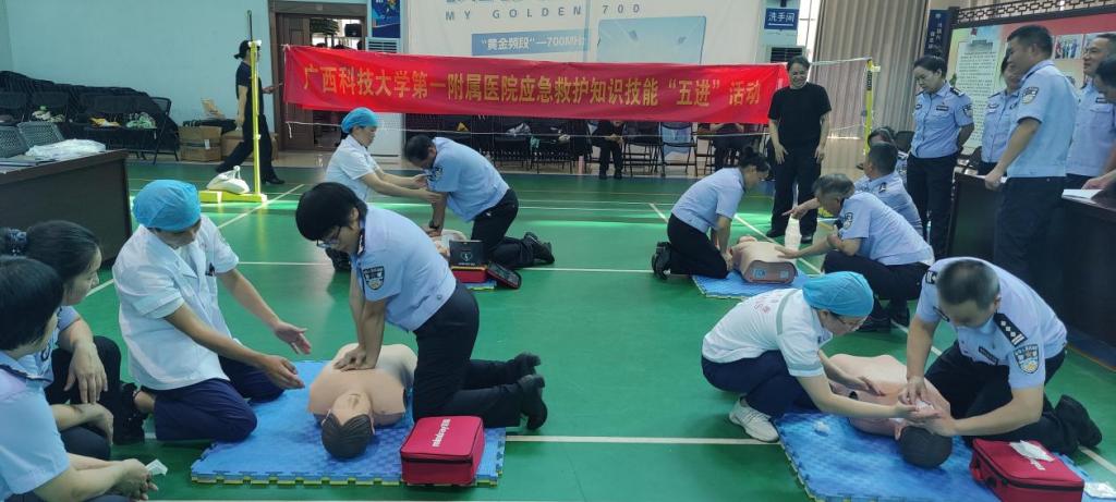 广西科技大学第一附属医院是柳州市市民急救学校分校之一,多年以来,积极响应柳州市卫生健康委员会、教育局、应急管理局、团市委、柳州市红十字会关于开展应急救护知识技能进社区、进农村、进学校、进机关及企事业单位、进家庭(简称“五进”)活动的号召,致力于急救知识及急救技能的培训和普及,每年开展“五进”活动20余场,培训人员每年达3000-6000余人。今年初,柳州监狱、桂中监狱邀请我院为两家监狱工作人员进行急救知识培训。为更好开展五进活动,我院成立了由科教科牵头,临技中心提供支持,以急诊科医护人员为主要培训师资的培训小组,精心制订了培训方案并组织实施。