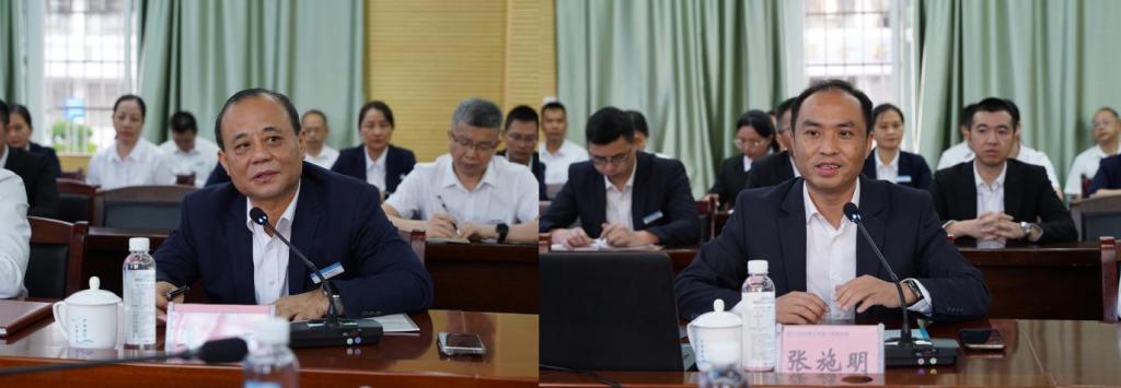 广西科大一附院院长覃天(左)作医院泛血管疾病管理中心工作情况介绍,广西科大二附院院长张施明(右)作为医院泛血管疾病管理中心发起人作执行主任发言