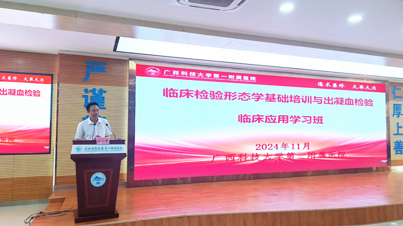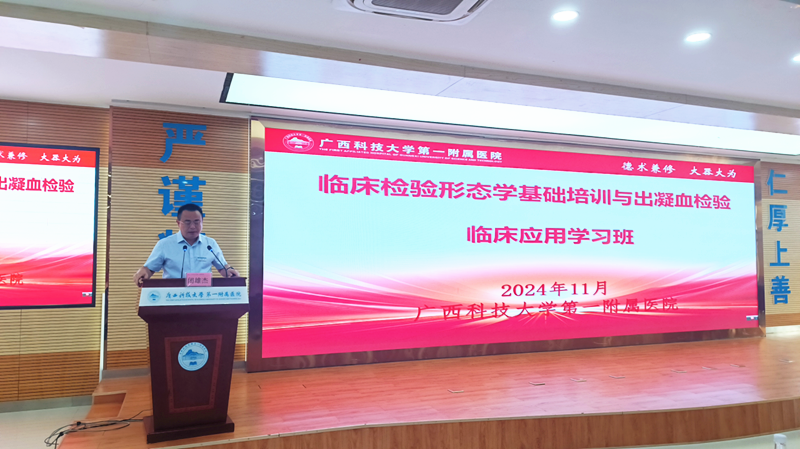 为提升临床检验医学专业工作者细胞形态鉴别能力和血栓疾病诊断能力,更好的推动血液系统疾病诊断和检验工作,11月17日,广西科技大学第一附属医院在医院学术报告厅举办自治区继续医学教育《临床检验形态学基础培训和出凝血检验临床应用》学习班。医院党委委员、副院长闭雄杰出席了本次研讨班开幕式并致辞。会议由项目负责人医学检验科主任关小勇主持。