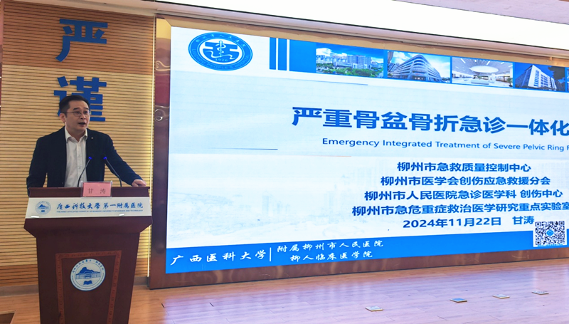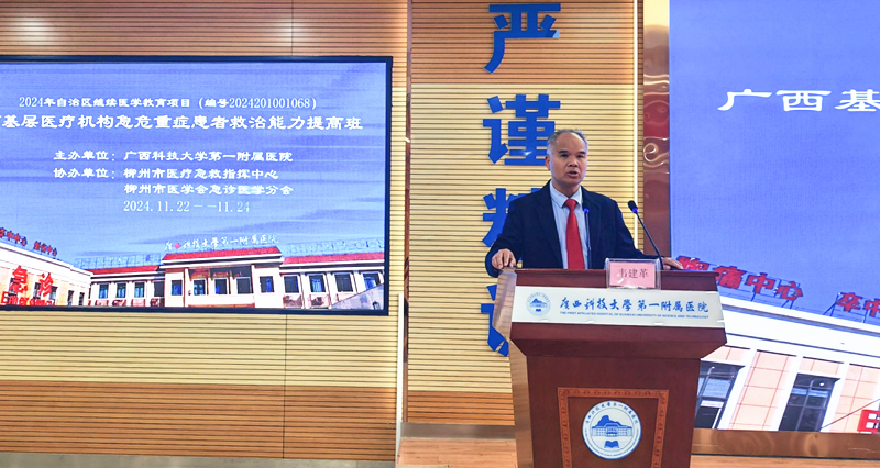 为提高广西基层医疗机构医护人员的急救能力,强化急救技能,2024年11月22至24日,由广西科技大学第一附属医院联合柳州市医疗急救指挥中心、柳州医学会急诊分会共同举办的“2024年广西基层医疗机构急危重症救治能力提高班”在医院学术报告厅成功举办。广西科技大学第一附属医院党委副书记、院长覃天教授、柳州市医疗急救指挥中心副主任王彬等出席开班仪式。开班仪式由急诊科主任韦建革教授主持。