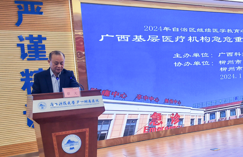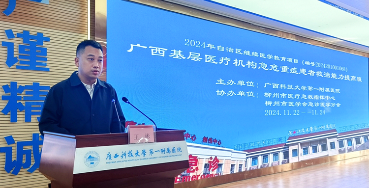 广西科技大学第一附属医院党委副书记、院长覃天致辞。他代表医院向各位专家、学员们表示热烈欢迎。他表示,我院作为国家三级甲等医院、综合大学的教学医院,医院的急救体系建设得到了长足发展,尤其近年来急诊科专家团队不遗余力地对基层医疗机构开展急救知识和技能培训,对提高桂中地区基层医疗机构急救能力发挥了重要作用。此次急危重症救治能力提高班,以“五大中心”建设为切入点,在技术和管理层面上提供了交流学习平台,必将为进一步提升全区基层医疗机构急诊急救能力,保障人民健康和生命安全做出积极贡献。