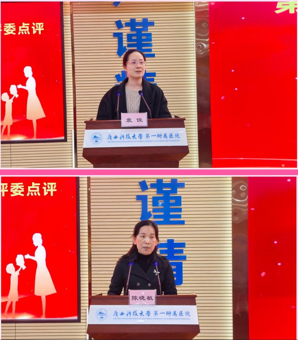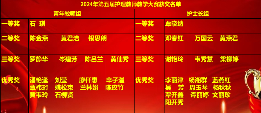 决赛紧张而激烈,选手们以图文并茂的PPT呈现授课内容,展现了护理人扎实的专业和教学素养以及良好的精神风貌。经过评委团认真、公平、公正的评审,最终重症医学科石琪、普外科三病区副护士长覃晓纳分别获得青年教师组、护士长组一等奖,其余选手分别获二、三等奖及优秀奖。