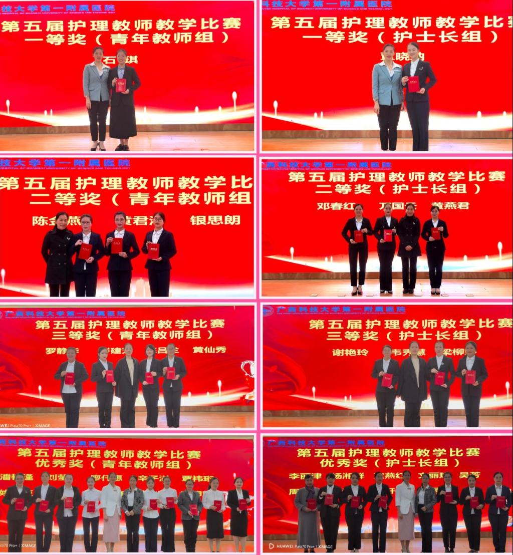 本次大赛分初赛和决赛两个阶段,选手分为护士长组和青年教师组,经过内科片区、外科片区、综合片区初赛激烈角逐,最终18位选手进入决赛。决赛邀请临床技能教学及培训中心主任陈晓敏、教学科科长袁俊以及护理部主任玉铭、护理部副主任农宝兰、大内科护士长华锋凯、大外科护士长李怀英、综合科护士长韦雪艳、李仁华老师作为评委进行现场评分和教案评分。