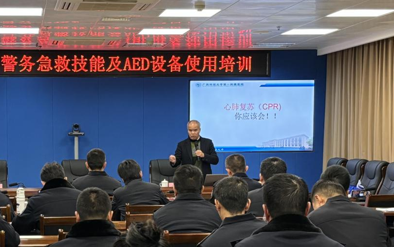 2024 年 12 月 13 日下午,柳州市公安局举办了一场急救知识技能培训会,全市各县区 50 多名技能教官参与培训。此次培训由广西科技大学第一附属医院首席急救医学专家、急诊科主任韦建革教授及两名急诊科医护人员担任教官。