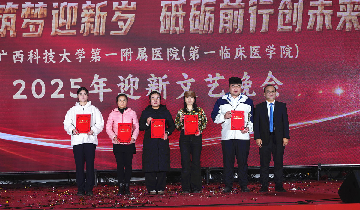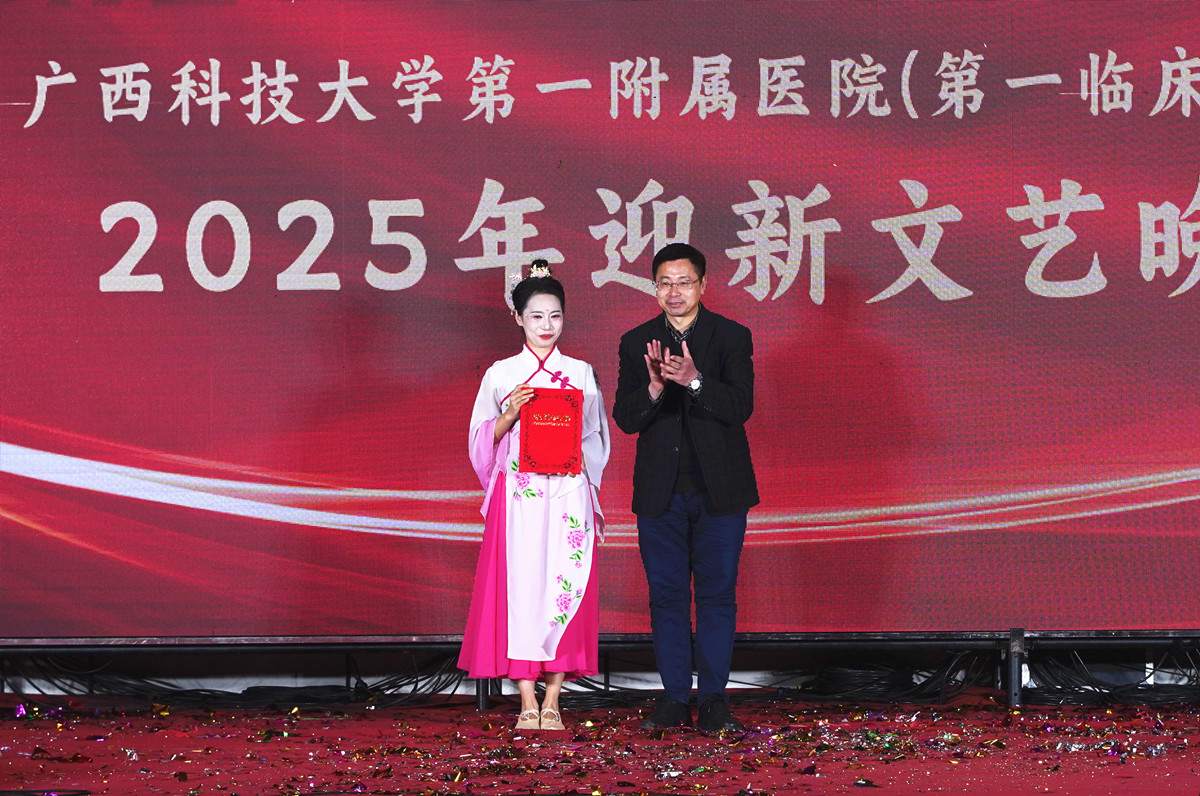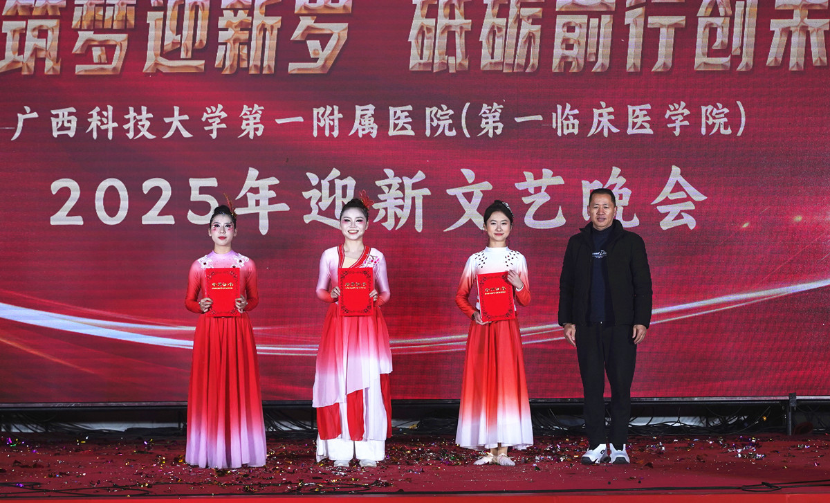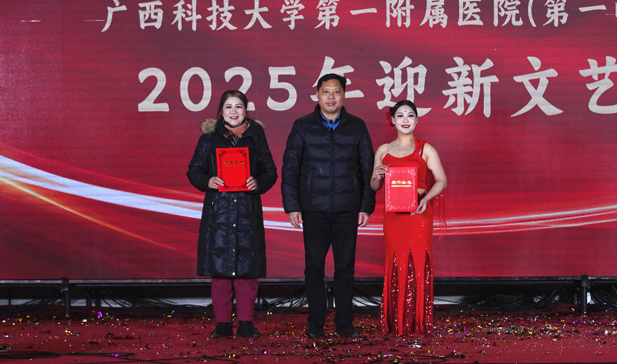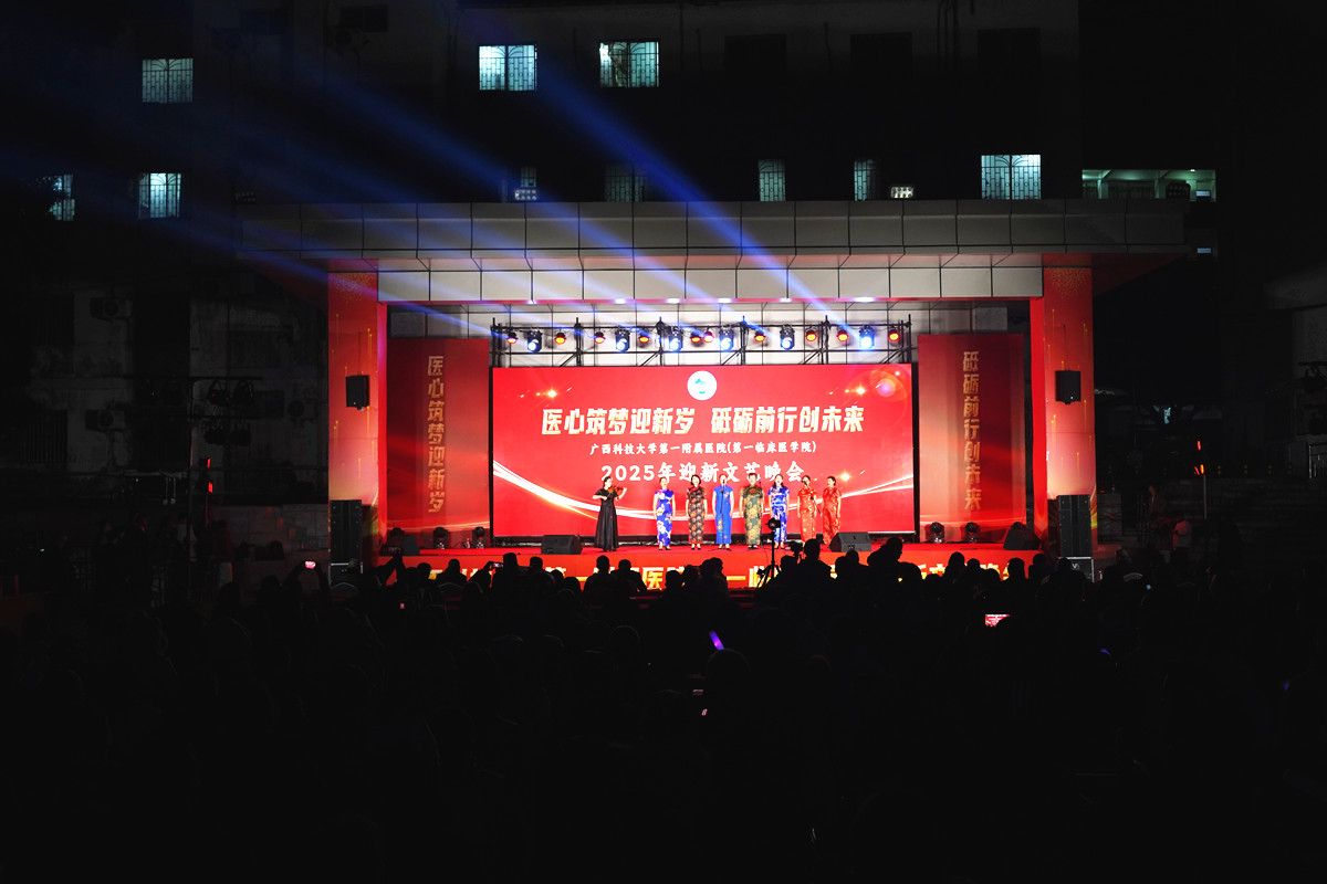 为丰富职工业余文化生活,展现职工团结奋进、蓬勃向上的精神风貌,2024年12月27日晚,广西科技大学第一附属医院(第一临床医学院)在学院操场举办了“医心筑梦迎新岁 砥砺前行创未来”2025年迎新文艺晚会。广西科技大学党委副书记宾月景,柳州市柳北区人民政府副区长梁融静,柳北区卫生健康局局长、党组书记、柳北区中医药管理局局长潘新胜,医院(学院)党委书记庞晓红、党委副书记、院长覃天等领导出席晚会。广西科技大学工会、学生工作部、团委领导,柳北区妇联领导,各医联体单位领导,评委老师、师生代表、职工及家属近400人欢聚一堂。