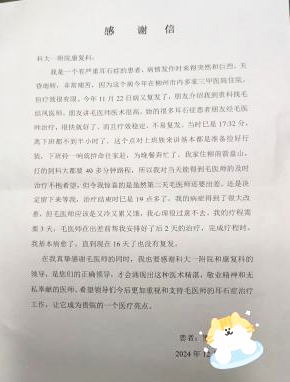 近日,患者罗女士将一封感谢信送给我院康复医学科毛结凤治疗师,赞叹精湛的医术和感谢医护人员的照顾。罗女士此前受耳石症长期困扰,多方治疗无果。11月22日再次复发后,经朋友介绍前来就诊,经检查与精确复位,罗女士的眼震和眩晕显著改善。让我们一起来了解耳石症和前庭康复吧。