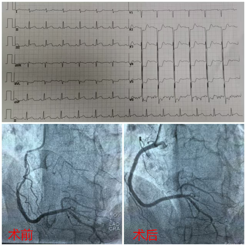 经过广西科技大学第一附属医院急诊科和心内科医护人员的积极抢救,急诊冠脉造影提示右冠脉开口至中段严重狭窄,予紧急植入支架后血管管腔恢复,患者转危为安。