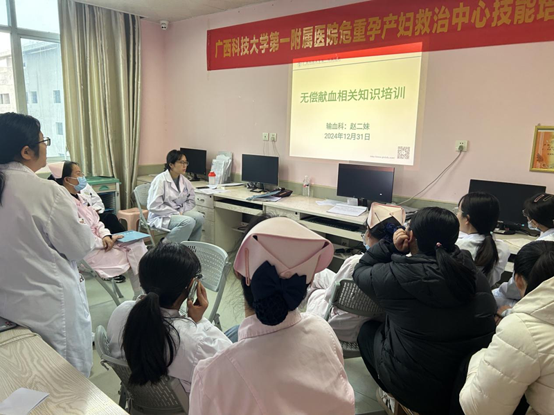 为进一步宣传无偿献血相关知识,提倡无偿献血,促进文明新风,弘扬社会主义核心价值观。广西科技大学第一附属医院(第一临床医学院)高度重视无偿献血工作,于2025年1月8日开展全院性无偿献血相关知识培训,医院输血科还来到临床科室一线,为坚守岗位的一线医护人员普及无偿献血知识。