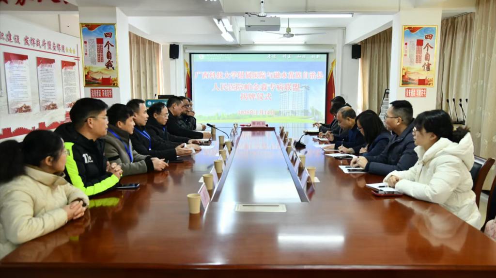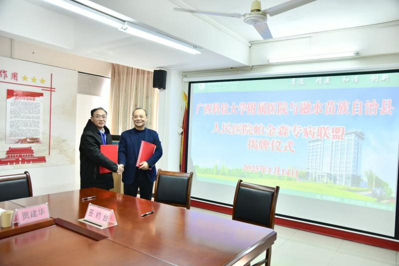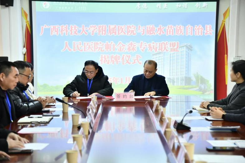 2025年1月14日,广西科技大学第一附属医院与融水苗族自治县人民医院签订帕金森专病联盟共建协议。广西科技大学一附院党委副书记、院长覃天、副院长黄进瑜、副院长陈瑞,融水苗族自治县人民医院院长周仲佑、常务副书记赵忠新、副院长贾旭荣等双方院领导出席签约仪式。此次合作旨在通过资源共享、优势互补,共同提升帕金森病诊疗水平,为患者提供更加全面、专业的医疗服务。