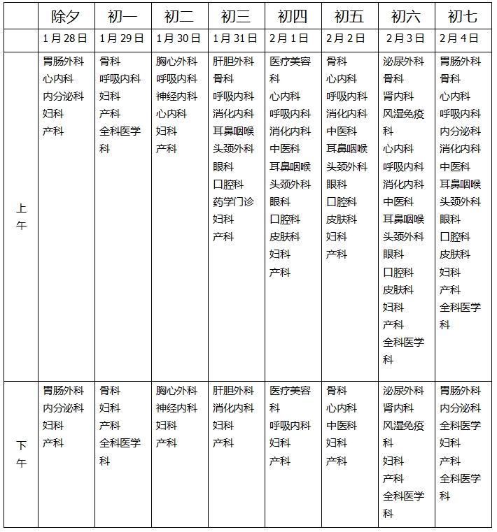 根据《国务院办公厅关于2025年部分节假日安排的通知》(国办发明电〔2024〕12号)精神,2025 年春节放假时间为:2025年1月28日至2025年2月4日,共8天。假期医院实行无假日医院工作制,现将我院春节假期门诊、急诊开诊信息公布如下。
