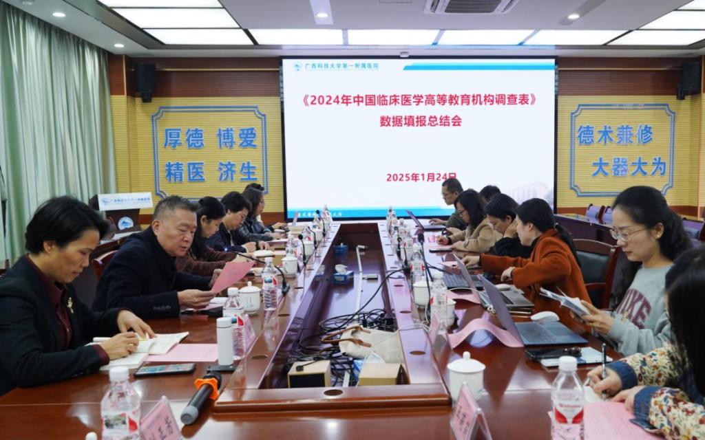 会议主要对《临床医学专业认证申报书》《2024年中国临床医学高等教育机构调查表》填报重要条款梳理及存在问题进行总结分析,对《广西科技大学临床医学专业认证工作方案》及专业认证自评报告撰写任务分工讨论,为当天下午的汇报会做好准备。