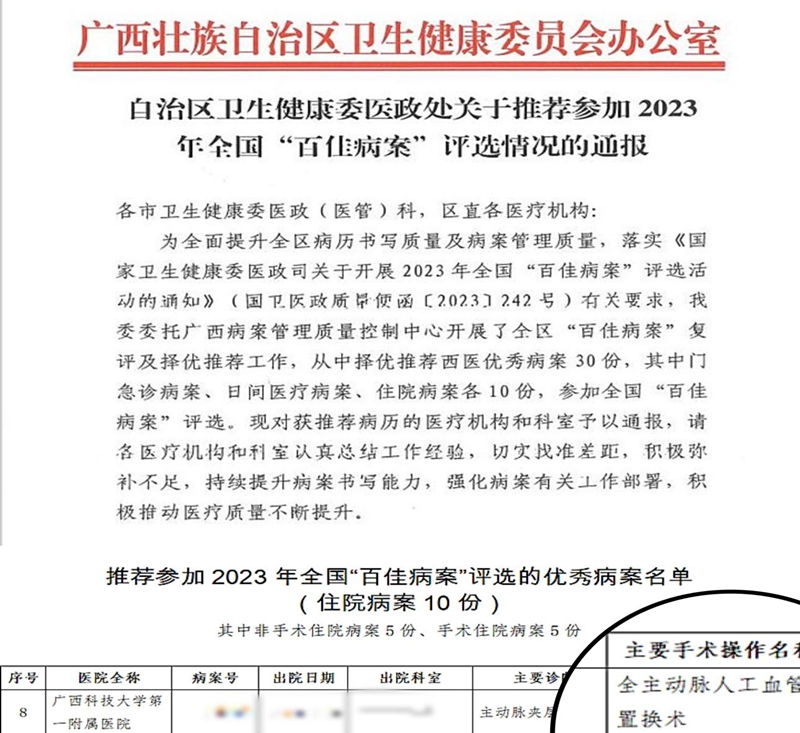 2024年1月,自治区卫生健康委、自治区中医药管理局发布《2023年全区“百佳病案”评选结果的通报》,胸心血管外科作为医院代表之一参加比赛,在30份病例中脱颖而出,获评自治区“百佳病案”。