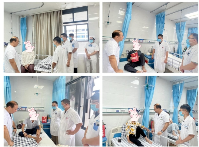 农历八月十五这天,我科全体医护人员在覃天院长带领下进行大查房并慰问住院患者。每到一间病房,覃天院长都仔细询问患者的治疗、康复情况,并将新鲜订制的月饼和水果送到每一位患者及家属手中,鼓励他们安心休养,积极配合治疗,争取早日康复。