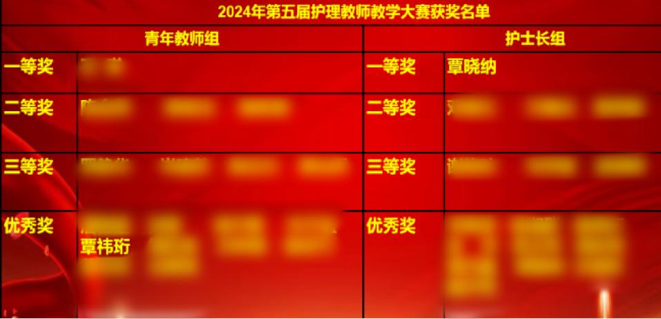11月27日,我院护理部举办第五届护理教师教学大赛,我科覃晓纳副护士长荣获护士长组一等奖,科室骨干覃祎珩护士荣获青年教师组优秀奖。