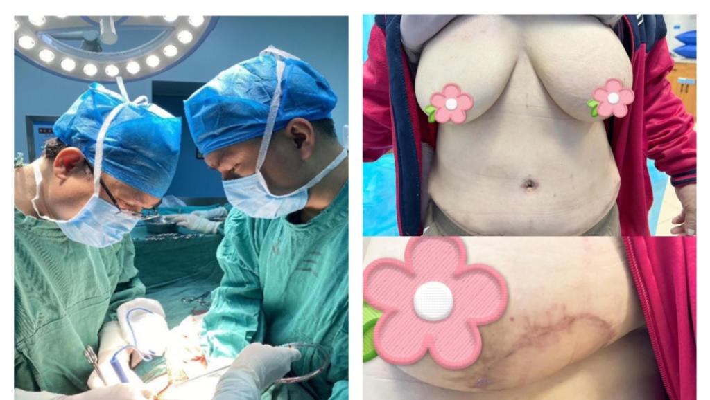 同月,医院党委副书记、院长、普外三病区学科带头人覃天和科室主任吴永晓成功完成院内首例乳腺癌患者保留乳头乳晕的全乳切除术+TRAM(横行腹直肌皮瓣)Ⅰ型乳房重建术+脐部整形术。术后患者皮瓣存活,恢复良好。患者及家属对再造的乳房颇为满意,也重燃了对美好幸福生活的信心决心。