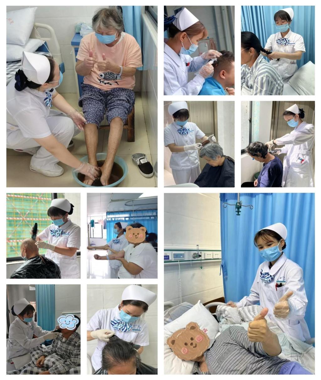 护理延伸,暖心服务。普外三病区许多乳腺癌患者做了几次化疗之后,头发掉得厉害,不敢在街上行走也不愿意去理发店,十分悲观。护士长组织护理人员征求患者意见,为患者进行理发护理,用真心温暖患者。护理人员还会根据患者需求提供洗头、刮胡须、剪指甲、洗脚等个性化护理服务,让他们舒适、安心、体面住院。