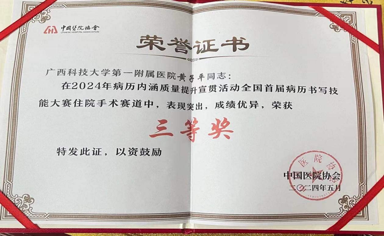 2024年5月,中国医院协会医疗质量与患者安全委员会在北京举行全国首届病历书写技能大赛,我科黄子平医师获评全国首届病历书写技能大赛“百强选手”,挺入总决赛,并在“百强选手”综合能力总决赛中,荣获个人三等奖,为广西唯一一个在全国首届病历书写技能大赛住院手术赛道获奖的选手,代表广西队进京参加2024年“全国首届病历书写技能大赛”。