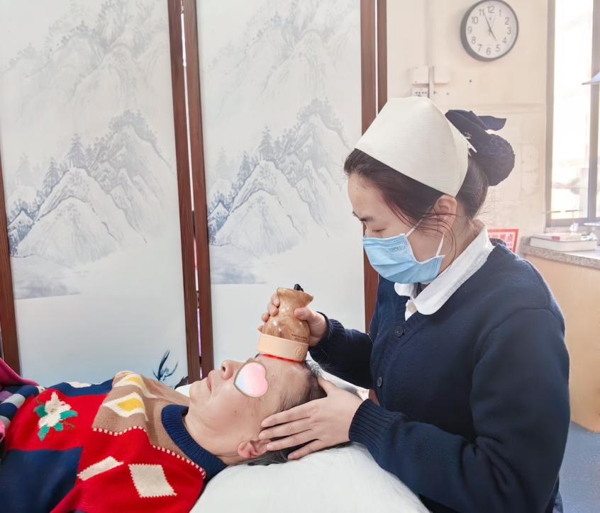 中医强调阳气在人体生命活动中的重要性,认为阳气不足则易受外邪侵袭,导致疾病发生。扶阳罐是一种结合了温灸、热敷、推拿等多种功效的中医特色器具。中医特色护理团队操作时,将扶阳罐在肖阿姨面部特定部位及经络上进行游走、旋转和点按,产生的温热效应能够深入肌肤,促进面部血液循环,使气血运行更加顺畅,对于患者的康复有着积极的促进作用。