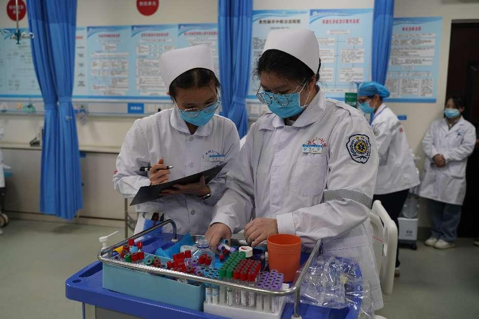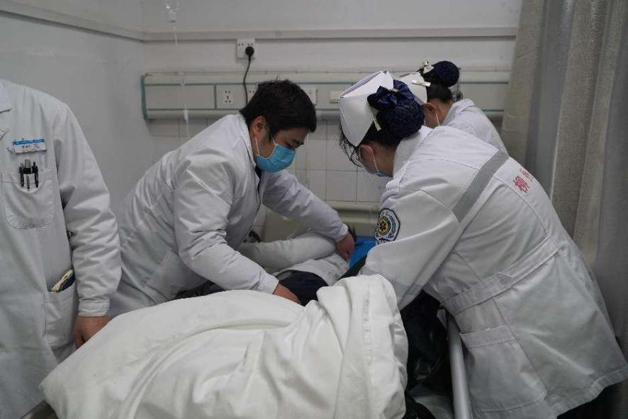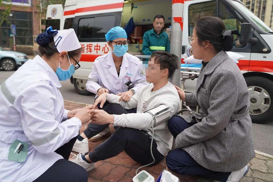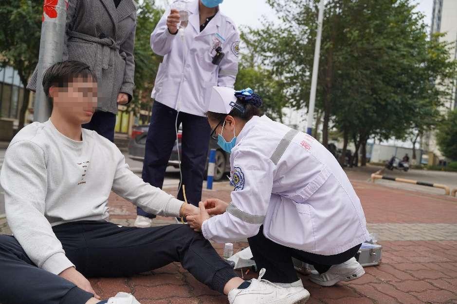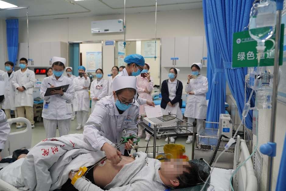 演练中,急诊科迅速响应,由学生模拟的“患者”和“家属”被快速接入急诊室。接到预警信息的神经内科、神经外科卒中诊疗团队快速响应参与多学科联合救治;立即启动卒中绿色通道,同步完成生命体征监测、病史采集和NIHSS评分,急诊科护士根据医师指令完成心电图、抽血等检查。检验科关小勇团队快速反馈实验室结果;CT室苏江主任团队第一时间完成头颅CT检查,排除脑出血后。