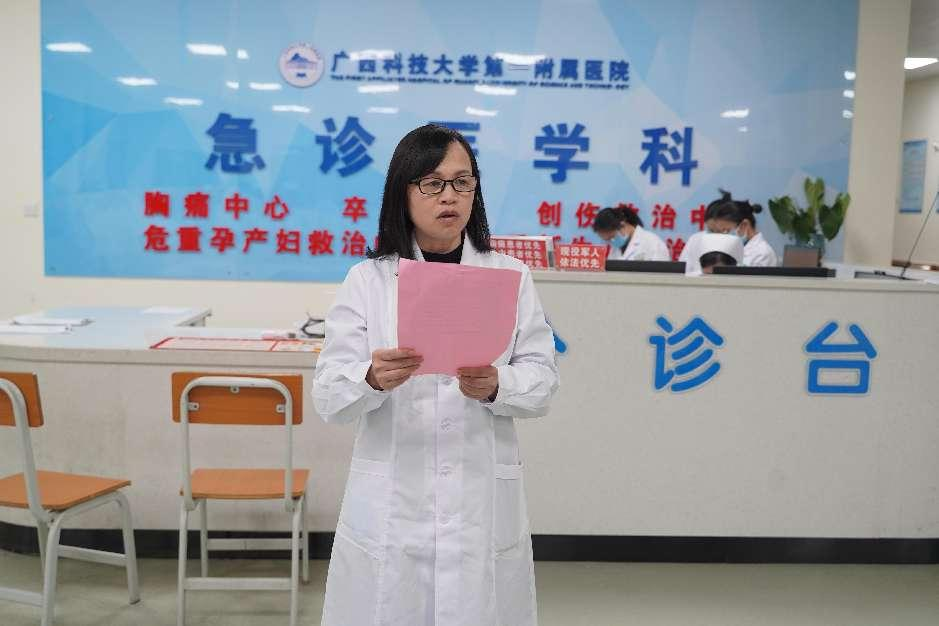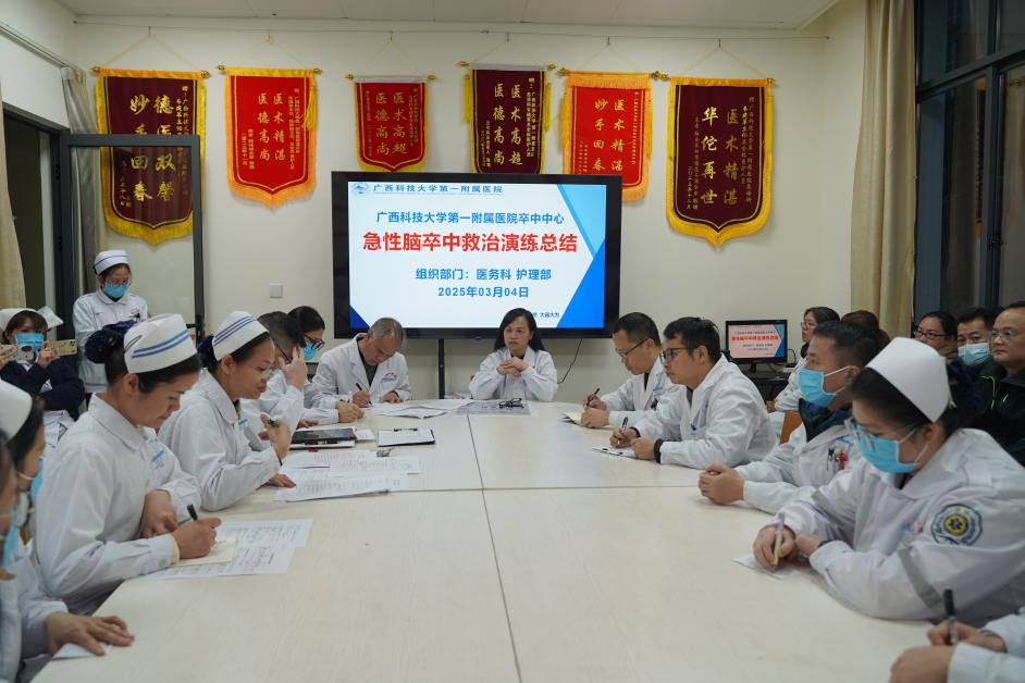 为全面推进三级医院卒中中心建设,提升急性脑卒中患者的综合救治能力,强化多学科协作机制,广西科技大学第一附属医院于3月4日下午17:30至18:30,开展了一场高规格、全流程的脑卒中救治联合演练。此次演练由黄进瑜副院长担任总指挥,医务部谢正德副部长主持,急诊科、神经内科、神经外科、CT室等六大核心科室协同参与,通过模拟真实病例救治场景,检验医院卒中中心建设的实战能力。