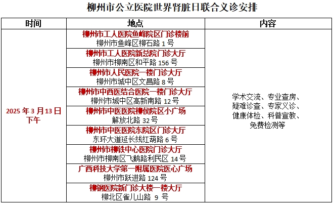 中国医师协会肾科医师分会全体专家将于3月13日(本周四)下午分批走进柳州市六家公立医院,同时开展世界肾脏日大型义诊、专业查房等活动!义诊地点如下。欢迎广大市民、肾友积极参与,共同守护肾脏健康!
