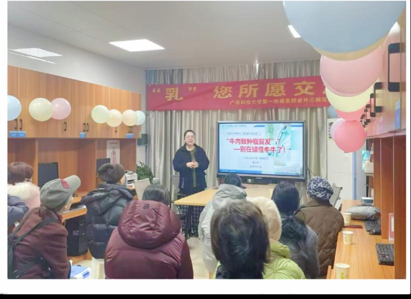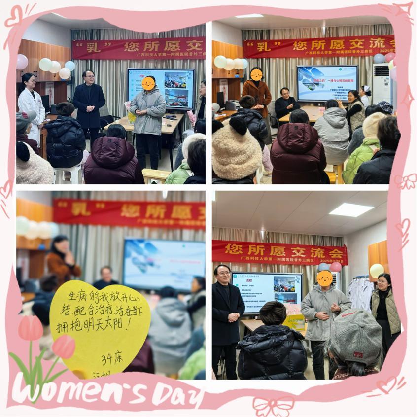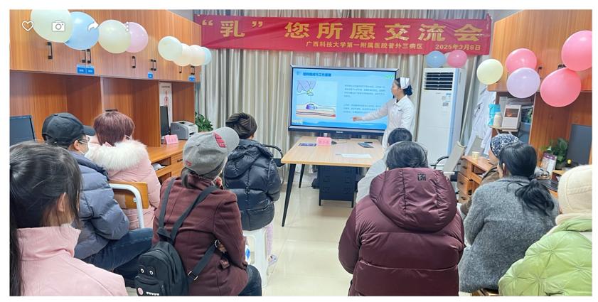 在这春意盎然的季节里,我们迎来了第115个“三八”国际劳动妇女节。为进一步贴近患者,搭建密切的医患沟通桥梁,医疗服务更有温度,我院普外三病区(乳腺外科)于3月8日下午15:00在病区会议室举办“乳您所愿,守护美丽”为主题的医患交流会,为乳腺癌患者及家属带来春日里的温暖守护。此次活动特别邀请了广西医科大学附属肿瘤医院陆永奎教授,与患者们一起共赴一场温暖与力量交织的心灵疗愈之约。