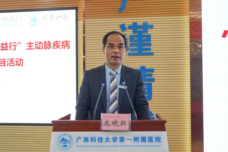 仪式伊始,”心脉益行"主动脉疾病贫困患者救济专项基金管理委员会主任朱清先生在签约仪式上致辞。他介绍了“心脉益行”项目的背景与意义,并表示主动脉疾病是一种严重威胁患者生命的疾病,许多贫困患者因经济困难无法得到及时治疗。“心脉益行“项目先后与全国20多家医院合作并成功救助了家庭经济困难的主动脉疾病患者130余人,而广西科技大学第一附属医院是目前救济患者人数较多的医院之一。随后,上海上善公益基金会秘书长赵伟发言,他向与会人员介绍了上善基金会的简要情况,并对“心脉益行"项目设立以来,广西科技大学第一附属医院领导、各科专家以及志愿者的爱心关注、支持和参与,尤其是胸心血管外科医护人员在对接和服务病患过程中做出的努力表达了感谢。他提出,希望通过“心脉益行"项目搭建起一个关爱主动脉疾病患者的平台,在进行一次性医疗费用救济和患者完成手术后,还能指导患者进行后续的康复和健康管理。