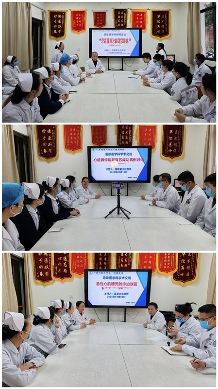 演练开始前,韦建革教授介绍了急诊科实施了十余年的团队心肺复苏经验,也介绍了急诊科承担2017年广西卫生适宜技术课题《城乡医疗机构心肺复苏团队实战演练的一体化研究》在2018至2022年在柳州、来宾两市14家县级医院及数十家乡镇医院普及、推广取得的成果,结合2010年至2020年国际心肺复苏指南要点,讲述团队心肺复苏中高质量的基本要求。