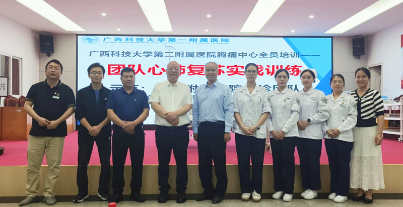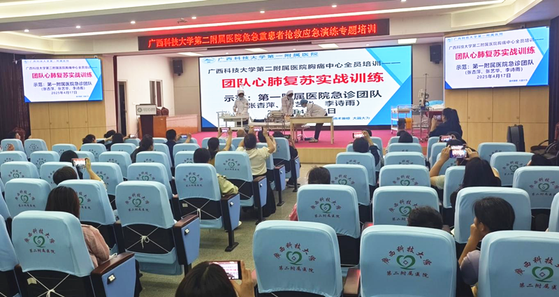 2025年4月17日,广西科技大学第一附属医院急诊团队受邀到广西科技大学第二附属医院开展团队心肺复苏(CPR)实战演练。演练由我院急诊科主任、主任医师韦建革担任技术指导,张杏萍医师、张艺华护师、李诗雨护师组成急救小组进行三人协作CPR示范。二附院医务部、护理部组织,全院各临床科室100余名医护人员参与培训。