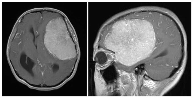 2022年起,17岁少女小潘开始反复出现左侧颞部胀痛,还伴随着头晕。这些症状呈阵发性,不过能自行缓解,起初并未引起她和家人的太多重视。后来,头晕头痛的症状愈发严重,恶心呕吐频繁出现,记忆力和语言表达能力也明显下降,学习成绩更是一落千丈。2023年的一天,家人带她到医院就诊。经过详细的检查,头颅核磁共振检查显示,左侧额颞顶部巨大占位性病变,初步考虑为脑膜瘤。这个消息,犹如晴天霹雳,让小潘和家人陷入了无尽的担忧与恐惧之中。
