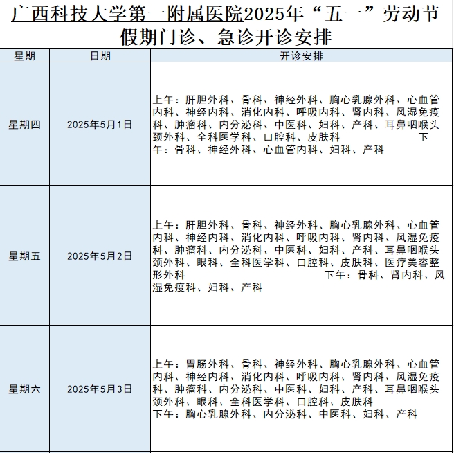二、内科、外科、妇产科均安排有医师出诊(见下表),具体出诊医师请登录“广西科技大学第一附属医院”微信服务号查询,或咨询门诊服务台:0772-2531722。住院病房、临床检验、超声医学科、医学影像学科等科室均安排值班医师应诊。