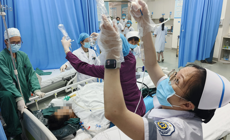 接到预警的急诊科团队早已做好准备。12时50分,患者进入急诊抢救室,测血压才70mmHg左右,情况危急。在医院首席急救医学专家、医院创伤中心顾问韦建革主任医师的主导下开展了救治,陈新副主任、韦秀慧护士长、我以及急诊科在岗的医护人员十余人立即行动。5分钟完成床旁超声检查发现腹腔内有积血,血压又迅速下降。“血压很低了,马上会心跳停止!““快点完成深静脉置管!”“派专人去输血科要血!”“报告医务部、立即启动急诊科抢救室开腹预案!”随着一系列的抢救,患者的血压回升到100mmHg,睁开了双眼!