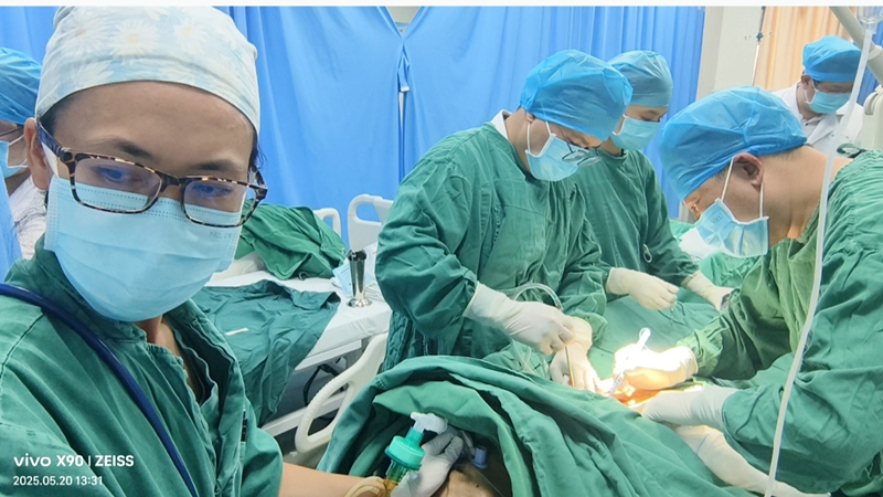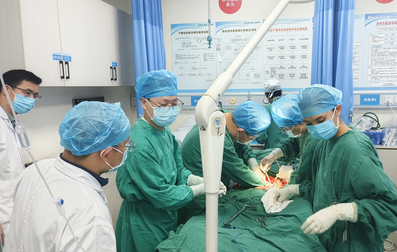 此时,医务部副部长谢正德,骨科二病区副主任覃武鹏,普外科二病区主任胡春格、甄宏云主任医师到达,麻醉科、手术室的值班医师、护士拿着手术包及器械冲向急诊科抢救室。随后,普外科一病区韦义伦、韦敬以副主任医师,麻醉科副主任梁治辉,还有更多的人加入抢救中。同时,输血科也紧急配血。13:30分剖腹开始。术中发现肝、脾破裂,多处小肠破裂,腹腔内积血2500ml。血止住了!肠破口补好了,血压也回升到正常!1个半小时后,由重症医学科与普外二病区医护团队安全将患者送入ICU。