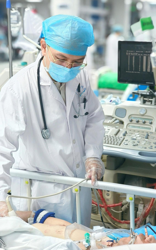 (图为ICU潘涛涛主任医师建立VA-ECMO插管)