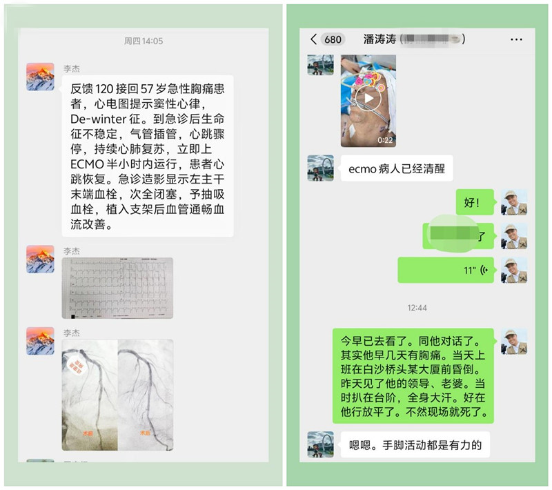 (左为急诊心脏介入手术后心内科李杰副主任医师的反馈,右为2025年5月24日患者清醒后潘涛涛与韦建革主任医师对话截屏)