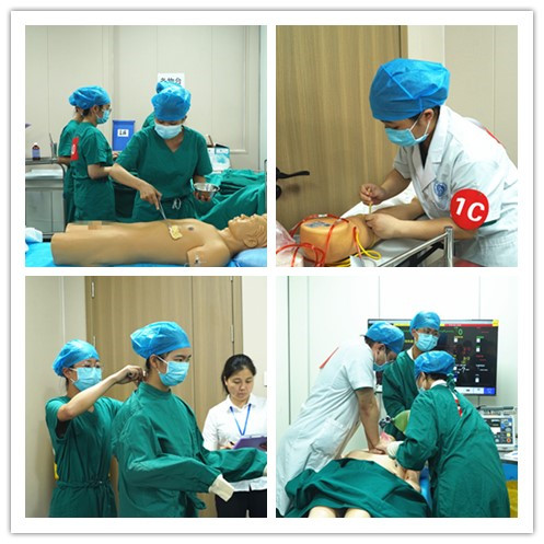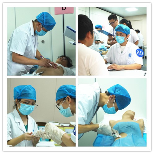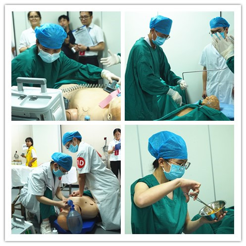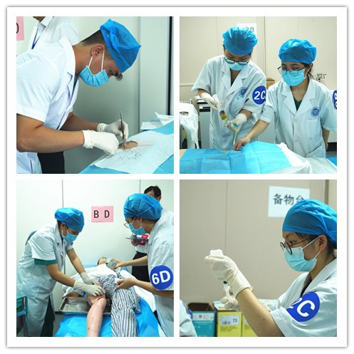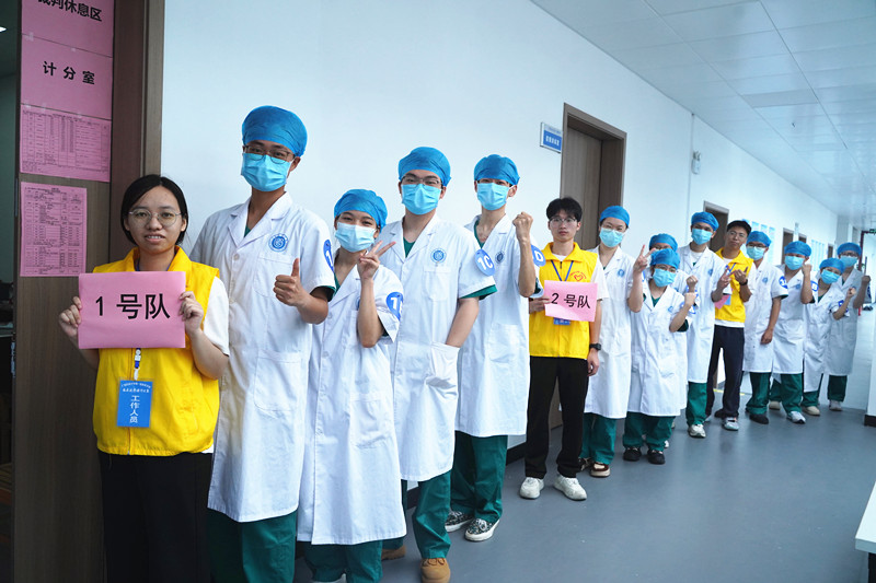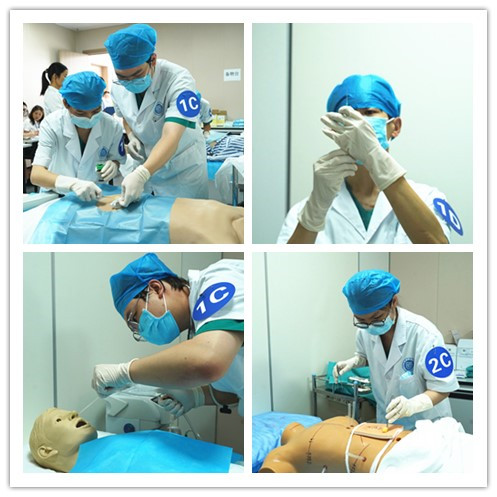 竞赛在实验综合楼临技中心进行。上午为初赛,采用赛站式,共设3个站点:第一站:病史采集、腹腔穿刺、男性导尿术;第二站:体格检查、骨髓穿刺、吸痰术;第三站:清创术、换药术(感染伤口)、缝合打结(两块缝合板)。