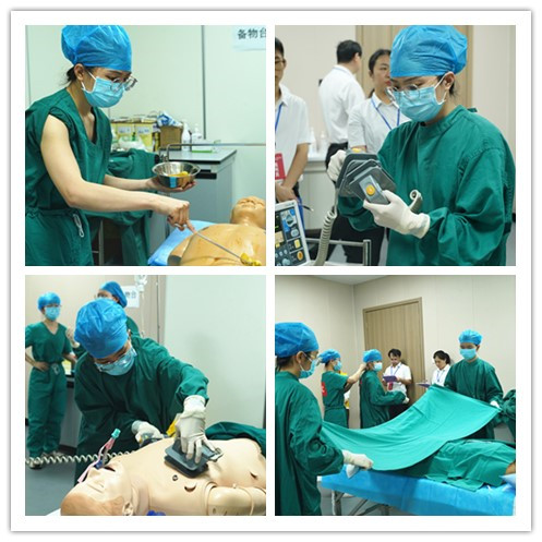 下午为决赛,采用赛道,首次使用高端模拟人,更贴近临床情境,也增加了竞赛难度。共设两个场景:第一场景:穿手术衣、戴手套;上腹消毒铺巾;第二场景:(模型:高端模拟人)医患沟通,动、静脉采血,心肺复苏、电除颤。面对模拟的复杂情境、真实的操作压力,选手们沉着应战、齐心协力、默契配合,充分展现了团队和个人实力。