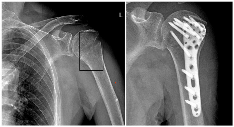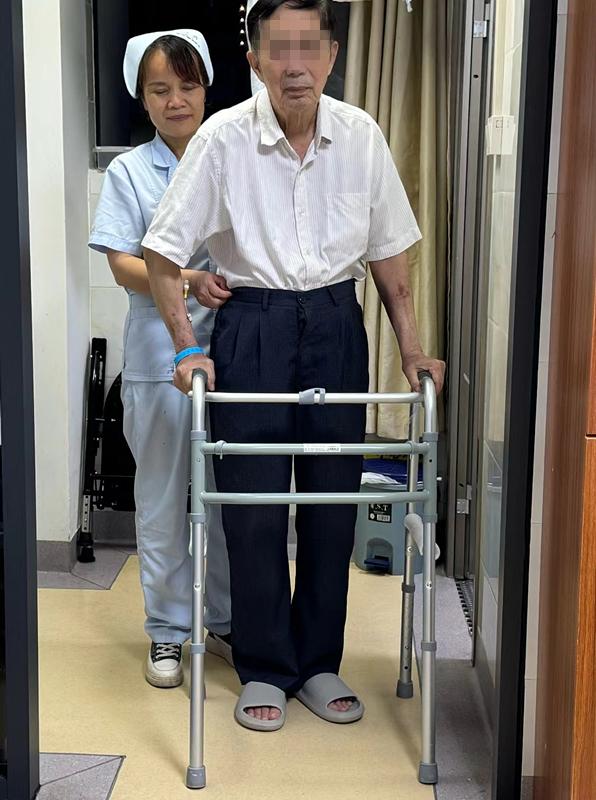 通过术前评估、血糖控制,在入院后的第三天赵顺吕医疗团队为患者进行了左肱骨切开复位内固定、左股骨转子间骨折闭合复位PFNA髓内钉手术。手术顺利结束,谢阿公返回病房,左臂的钢板与左腿的PFNA钉沉默地宣告着医学的胜利,但真正的考验才刚刚开始。病房里,时间被切割成无数个“第一次”:第一次抬腿时谢阿公额角的冷汗、第一次握紧助行器泛白的指节、第一次在护士搀扶下尝试重心转移时颤抖的呼吸……当谢阿公颤巍巍迈出第一步时,他的嘴角漏出了久违的微笑。