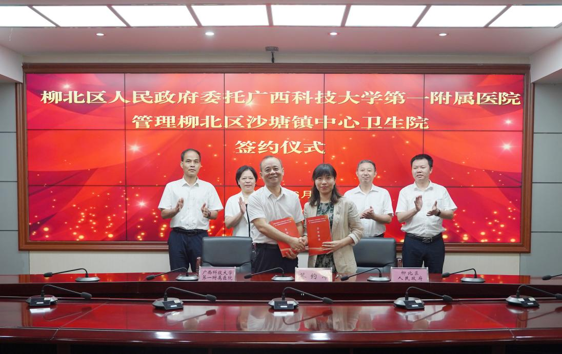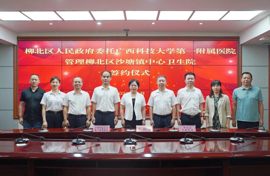 2025年6月11日上午,柳北区人民政府委托广西科技大学第一附属医院(下简称广西科大一附院)管理柳北区沙塘镇中心卫生院签约仪式在柳北区行政中心318会议室隆重举行。广西科技大学党委常委、副校长张海英,柳北区委副书记、区长洪进兴,柳州市卫健委党组副书记、副主任赵海,等领导出席仪式并致辞、讲话。