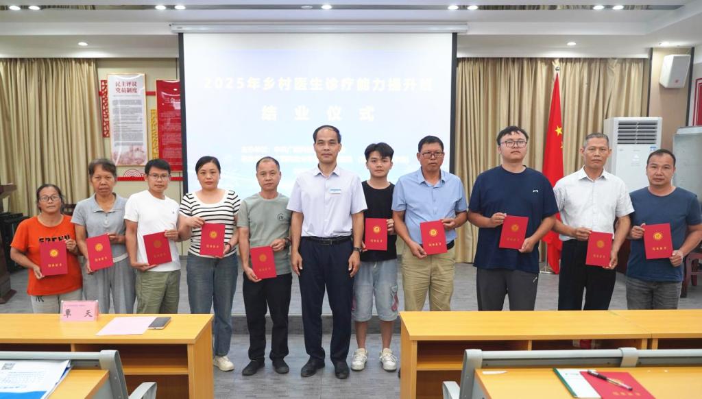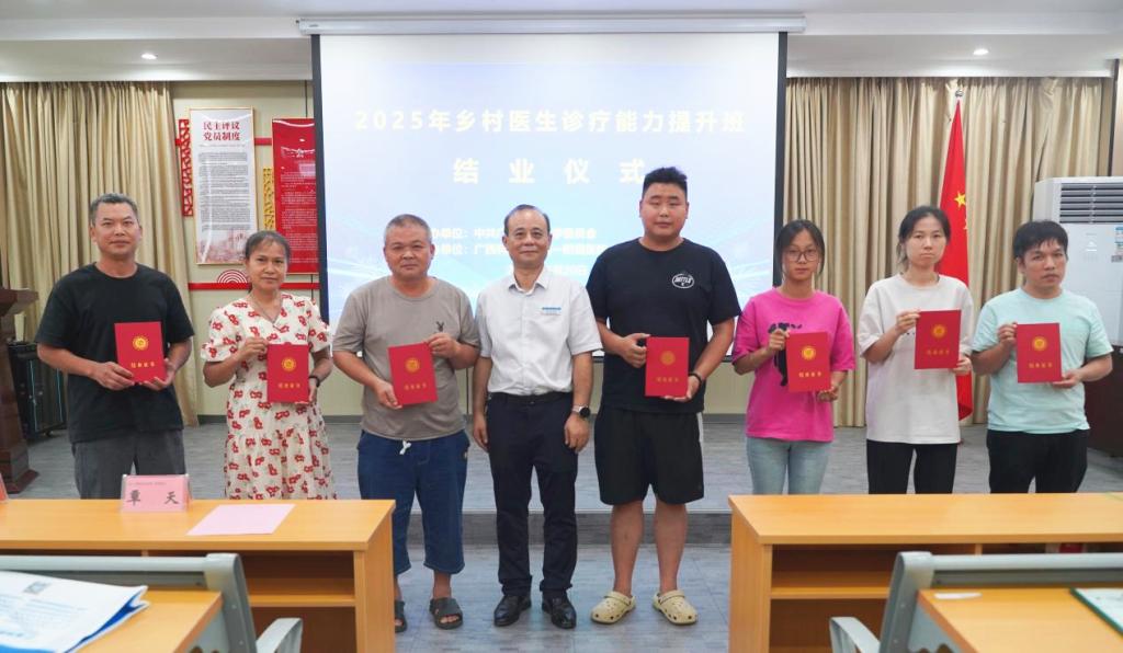 6月20日下午,广西科技大学第一附属医院(第一临床医学院)在第一临床医学院综合实验楼一楼党员活动室举办2025年乡村医生诊疗能力提升班结业仪式,78名来自基层的乡村医生完成培训任务,顺利结业。医院党委书记庞晓红、院长覃天等领导班子成员出席,并为学员代表颁发了结业证书。结业仪式由医院(学院)党委副书记何曲波主持。