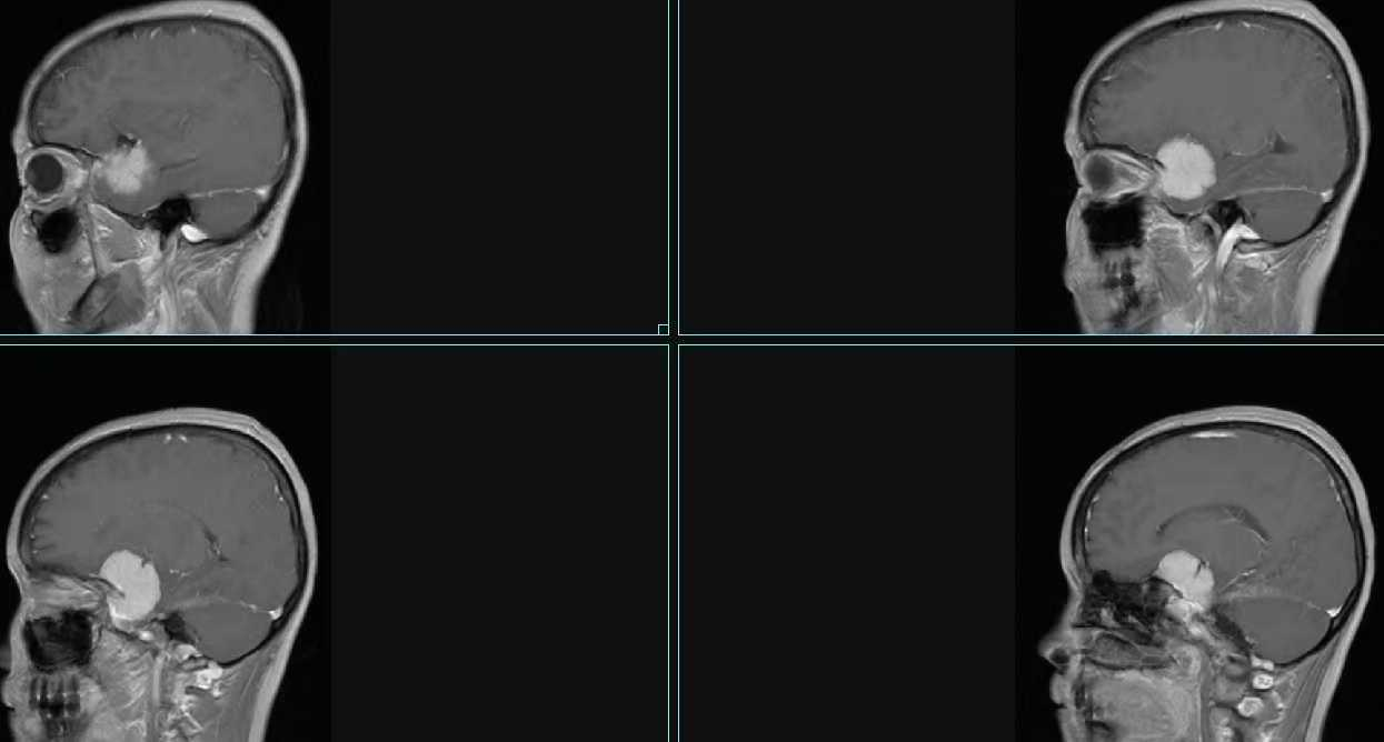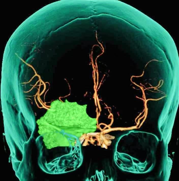 2023年2月起,张女士无明显诱因出现右眼视力进行性下降,视物模糊伴头部胀痛,偶发复视及眼前闪光点。在外院头颅MRI检查显示,右侧颞部外侧裂区有一团块影,考虑脑膜瘤,但未进一步治疗。“看东西越来越模糊,连手机字体都要调到最大,头痛时甚至影响正常生活。”张女士回忆。2023年5月5日,为明确诊治,张女士来到了广科大一附院神经外科就诊,经我院进一步检查,诊断为“右侧蝶骨嵴脑膜瘤”,术前检查提示肿瘤与颈内动脉、大脑中动脉分支紧密粘连。